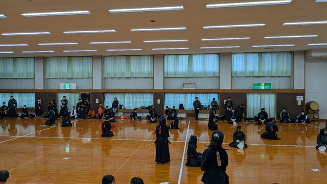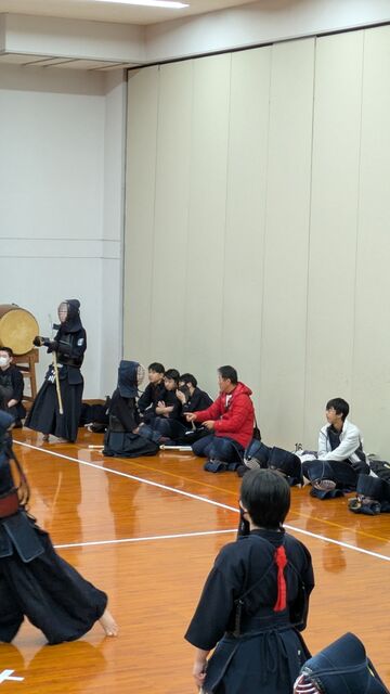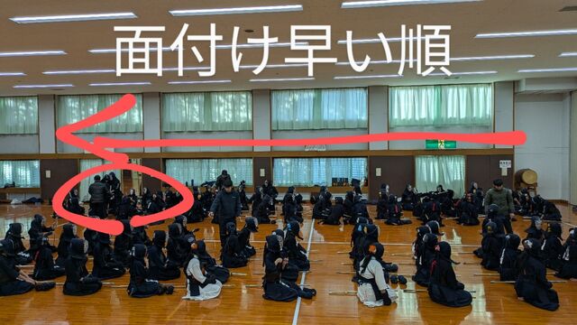 団体戦と個人戦が終わり、今日は最後に回り稽古も行いました。「面を付けた人から並んで!」の号令を聞いた中学生達は我先にとすぐに面を付けて並びます!